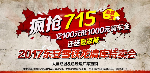 2017東安雪鐵龍年中冰點大促,大區(qū)總監(jiān)&總經(jīng)理廠家直銷,瘋搶715,交100元意向金抵1000元購車金,另外還送夏涼被,優(yōu)惠力度大。